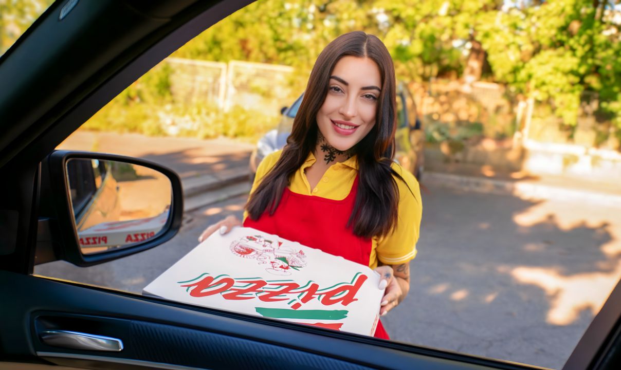 Sexy Argentinian Tabatha Lust delivered the pizza I’d ordered to my car, and I offered her extra cash if she showed me her big boobs. We sneaked into the bathroom for more privacy, and after checking out the thong-clad babe’s hot body, I offered her merch in exchange for sexual favours. Before I knew it, Tabatha was on her knees sucking me off, and then she stuck out her juicy bubble butt and took a doggystyle fucking. The tattooed slut treated me to another blowjob before bouncing her tight pussy on my cock in cowgirl. She took her top off so I could see her incredible titties, and then she rode me in reverse while I spanked the dark-haired nympho's fine ass. Her snatch felt so good, I was soon ready to cum, so I pulled out and spunked a load on Tabatha’s pierced tongue!